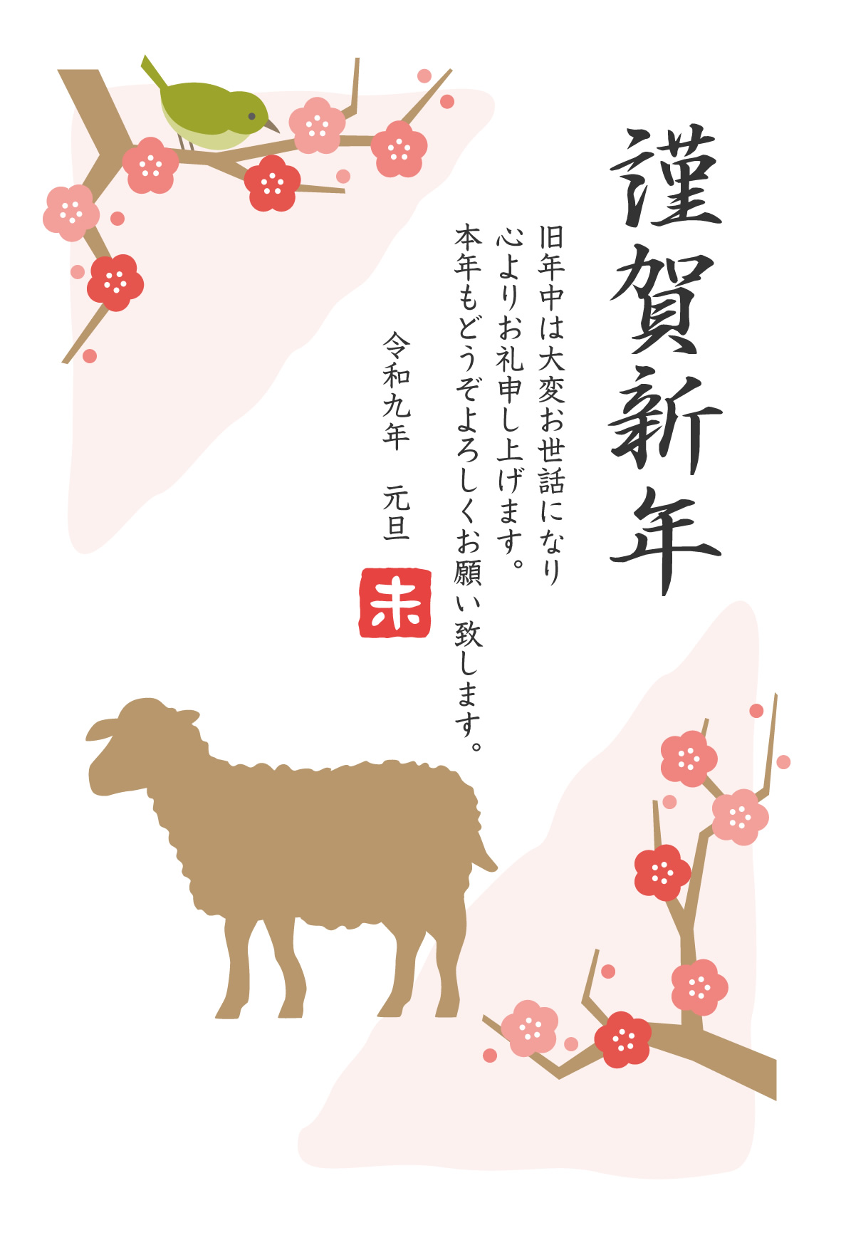 ビジネス用和風年賀状「干支(未・羊)と梅の木とウグイス」