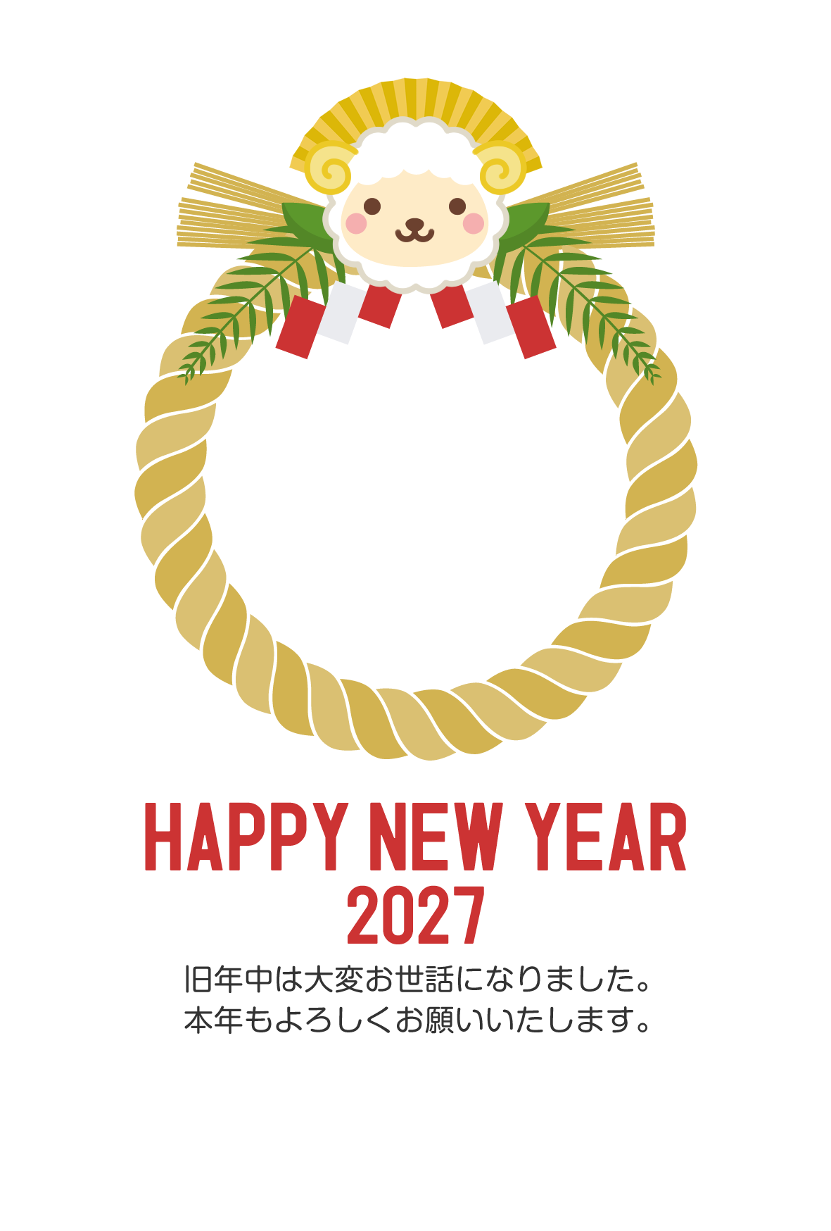 しめ縄のイラストの内側に写真が挿入できる、2027年(令和9年)未年の年賀状デザインテンプレート素材です。