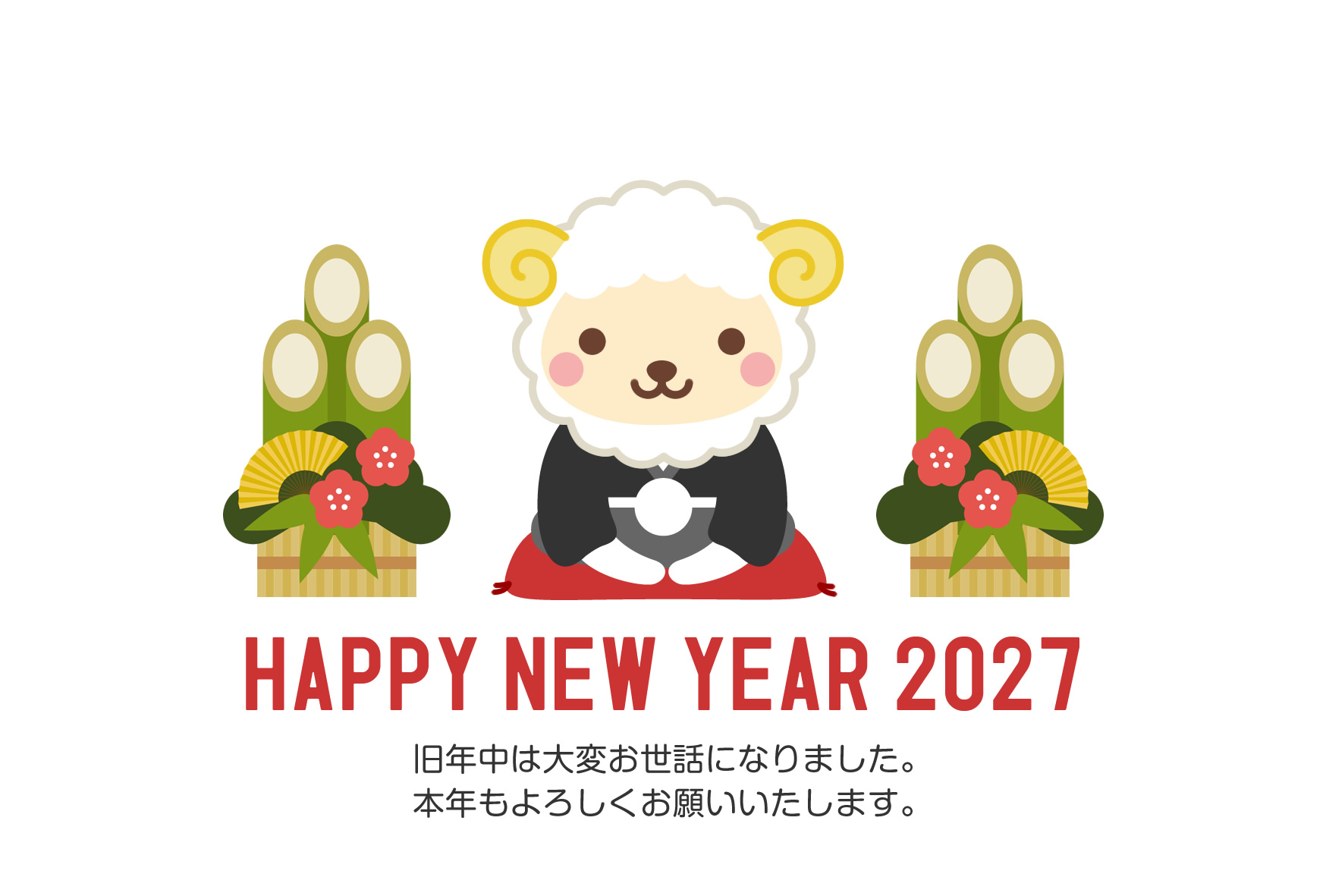 紋付袴を着た可愛い羊と門松の年賀状