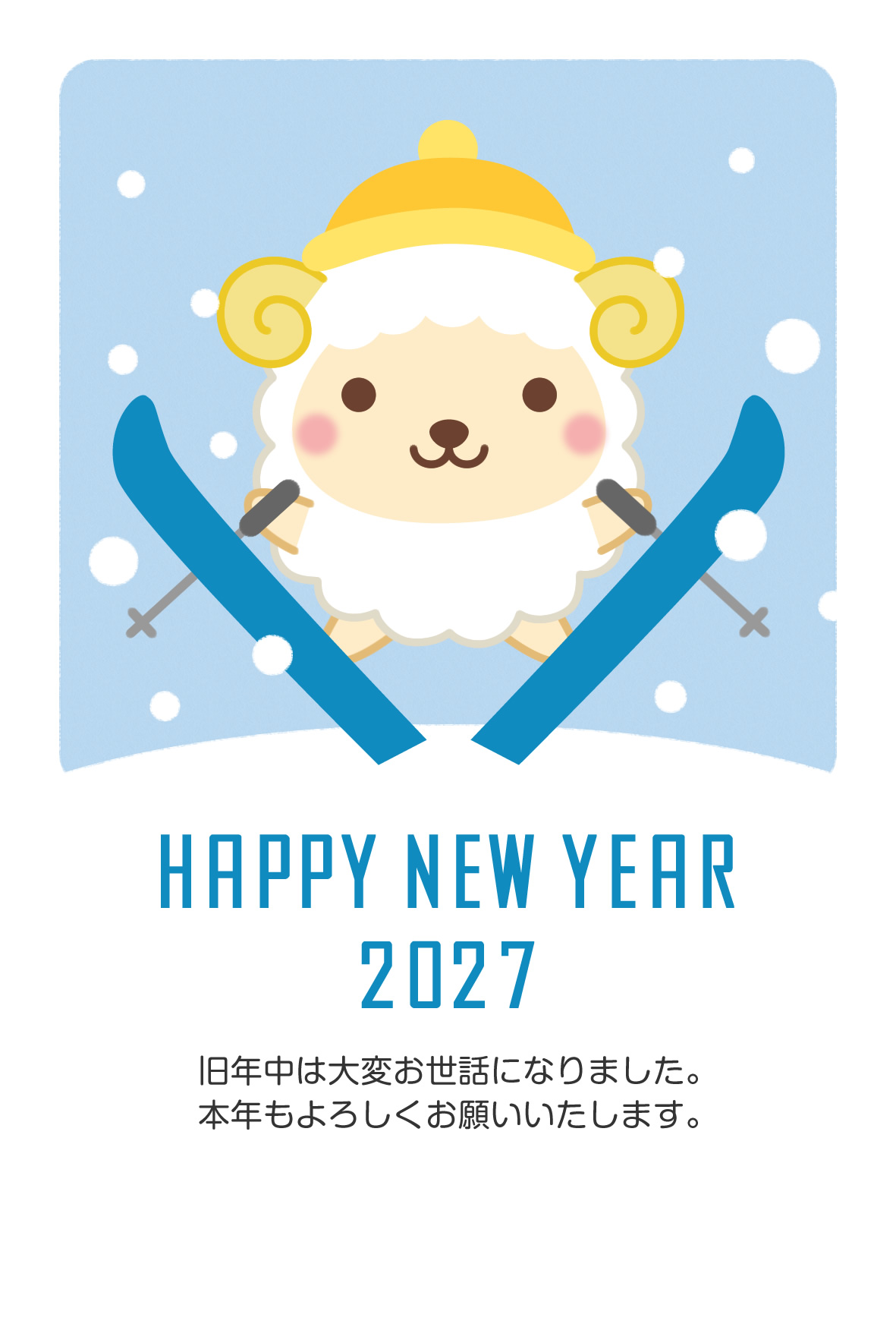 スキーでジャンプをしているかわいい未(羊)のイラストが入った、2027年(令和9年)未年の年賀状デザインテンプレート素材です。