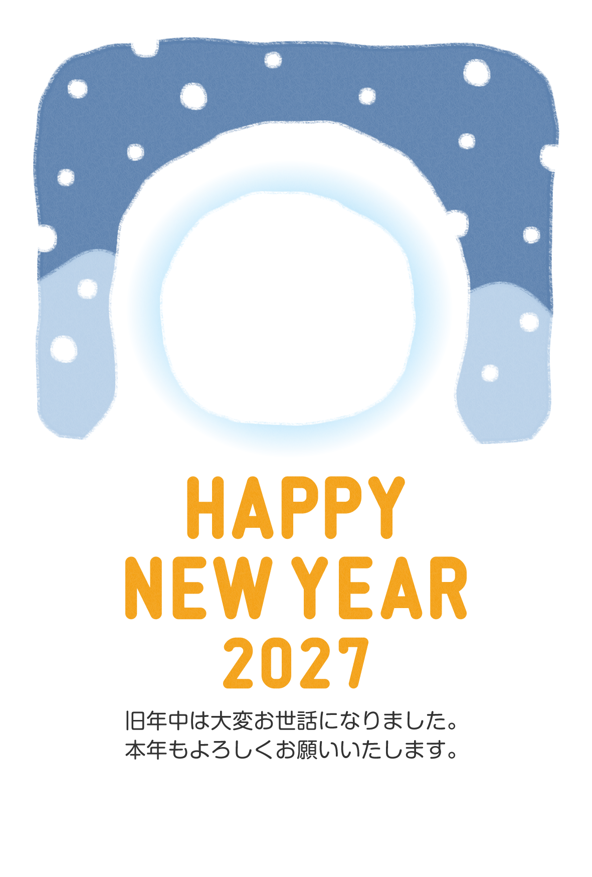 雪のかまくらのイラストの内側に写真が挿入できる、2027年(令和9年)未年の年賀状デザインテンプレート素材です。