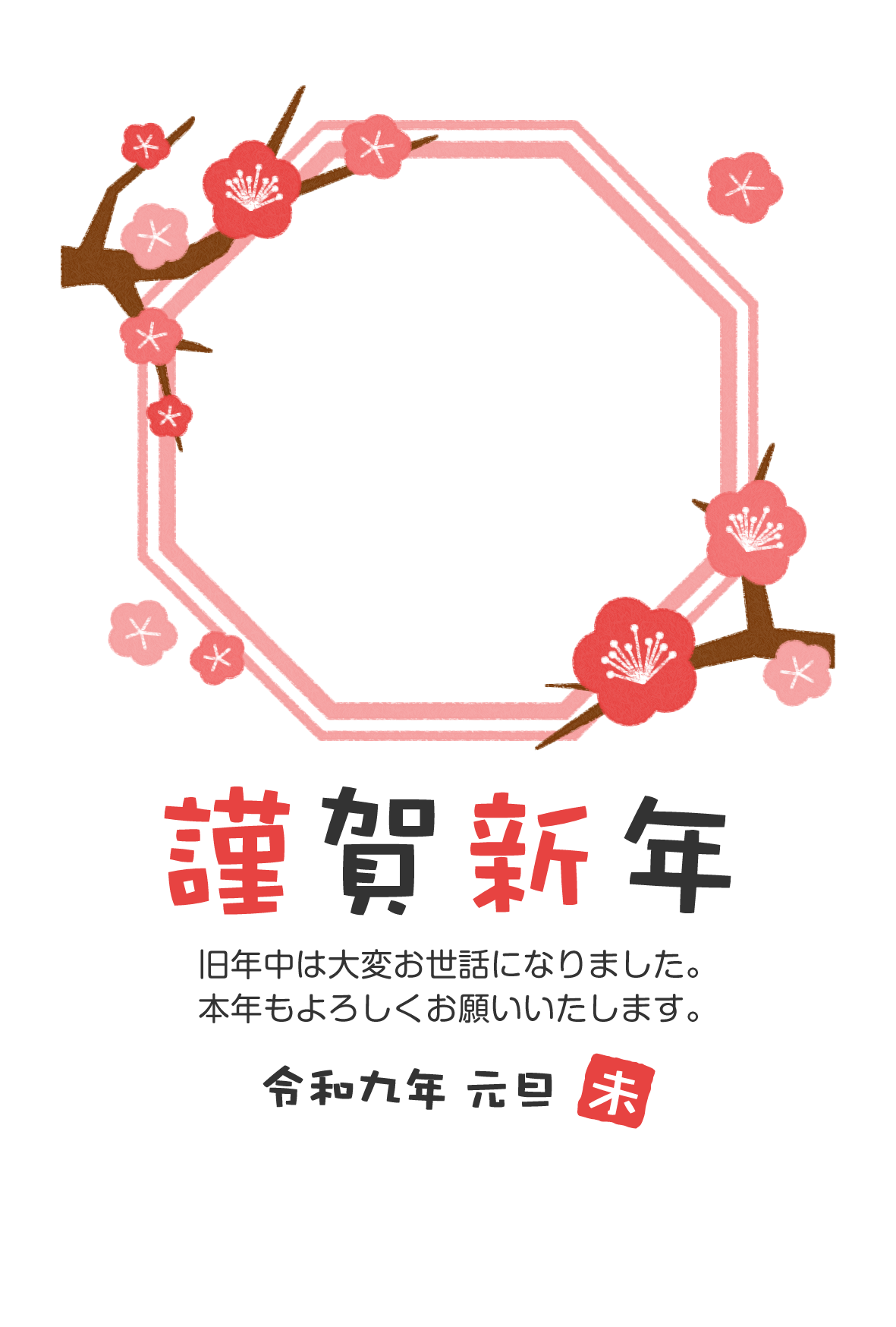 八角形のフォトフレーム枠のまわりに梅の木と花を飾った、2027年(令和9年)未年の年賀状デザインテンプレート素材です。