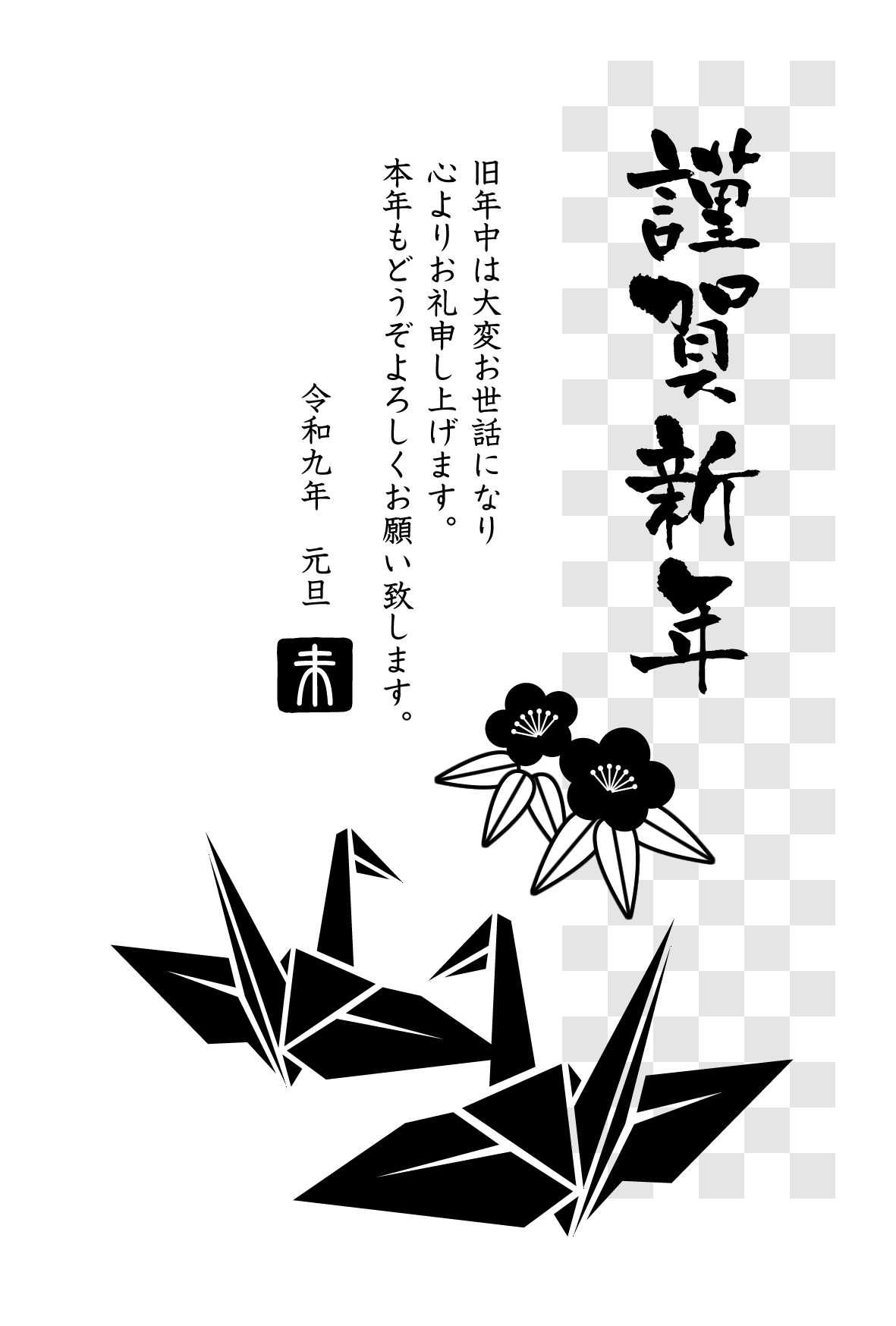 折り鶴の白黒モノトーンイラストが入った、2027年(令和9年)未年の年賀状デザインテンプレート素材です。